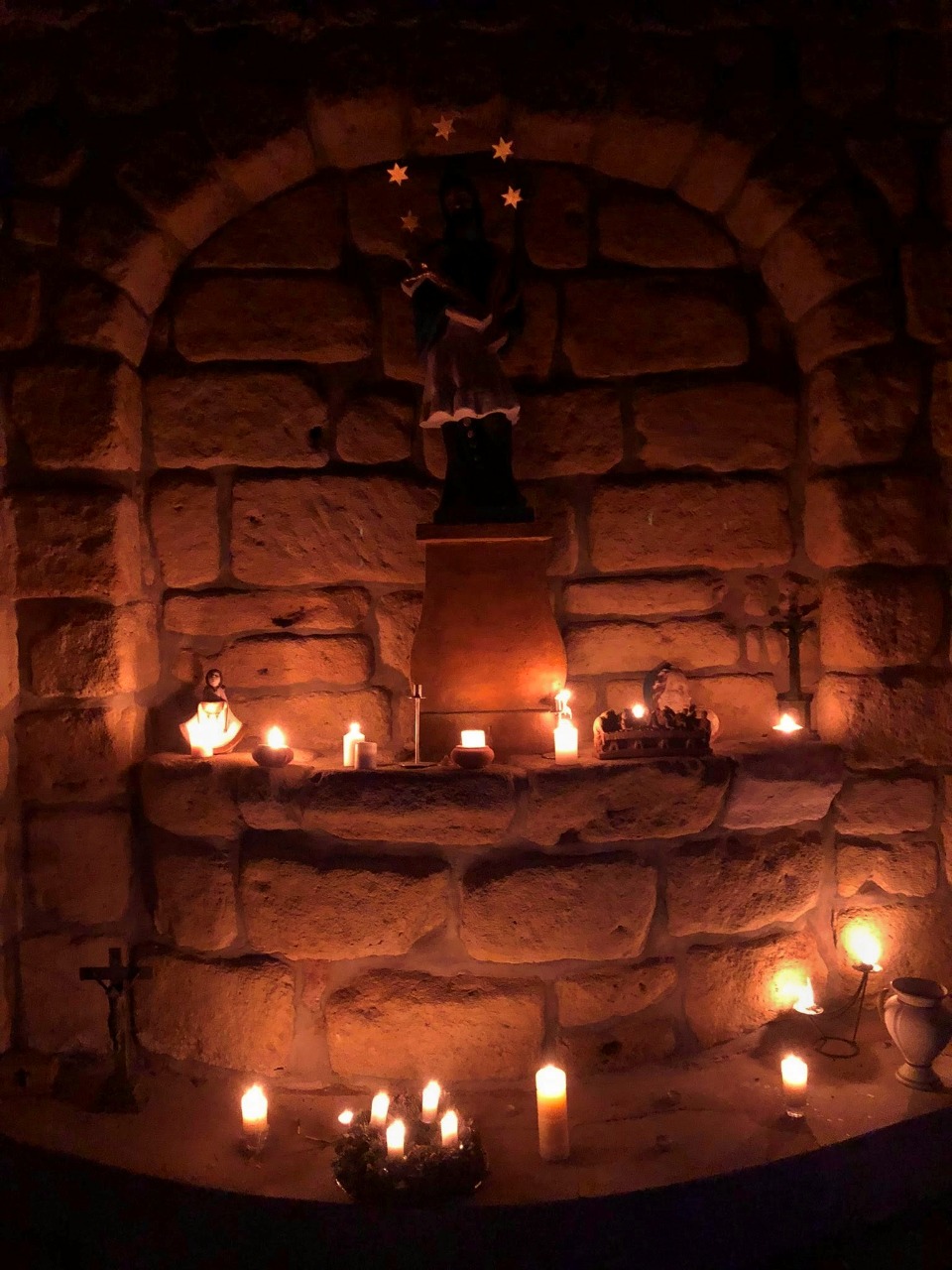 Po příjezdu k hasičárně jsme připravili nástroje, rozezpívali se a vydali jsme se pěšky ke kapličce jen s několika doprovodnými nástroji v ruce. Místní maličká kaplička, nejvýznamnější kulturní památka obce z roku 1796, nemá ani zavedenou elektřinu, ale zdálky nás přivítala do tmy svítícím okénkem – vnitřek byl ozářen pouze svíčkami – byl to jediný zdroj světla i tepla v tomto prostoru. Počítali jsme s tím a vzali i pár lampiček, které se nám již několikrát osvědčily.
